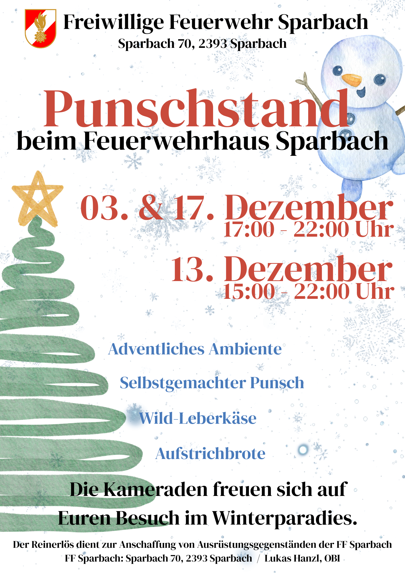 Auch in diesem Advent lädt die Freiwillige Feuerwehr Sparbach herzlich zum traditionellen Punschstand beim Feuerwehrhaus in Sparbach ein.An mehreren Dezemberterminen … Punschstand bei den Floriani´s in Sparbach